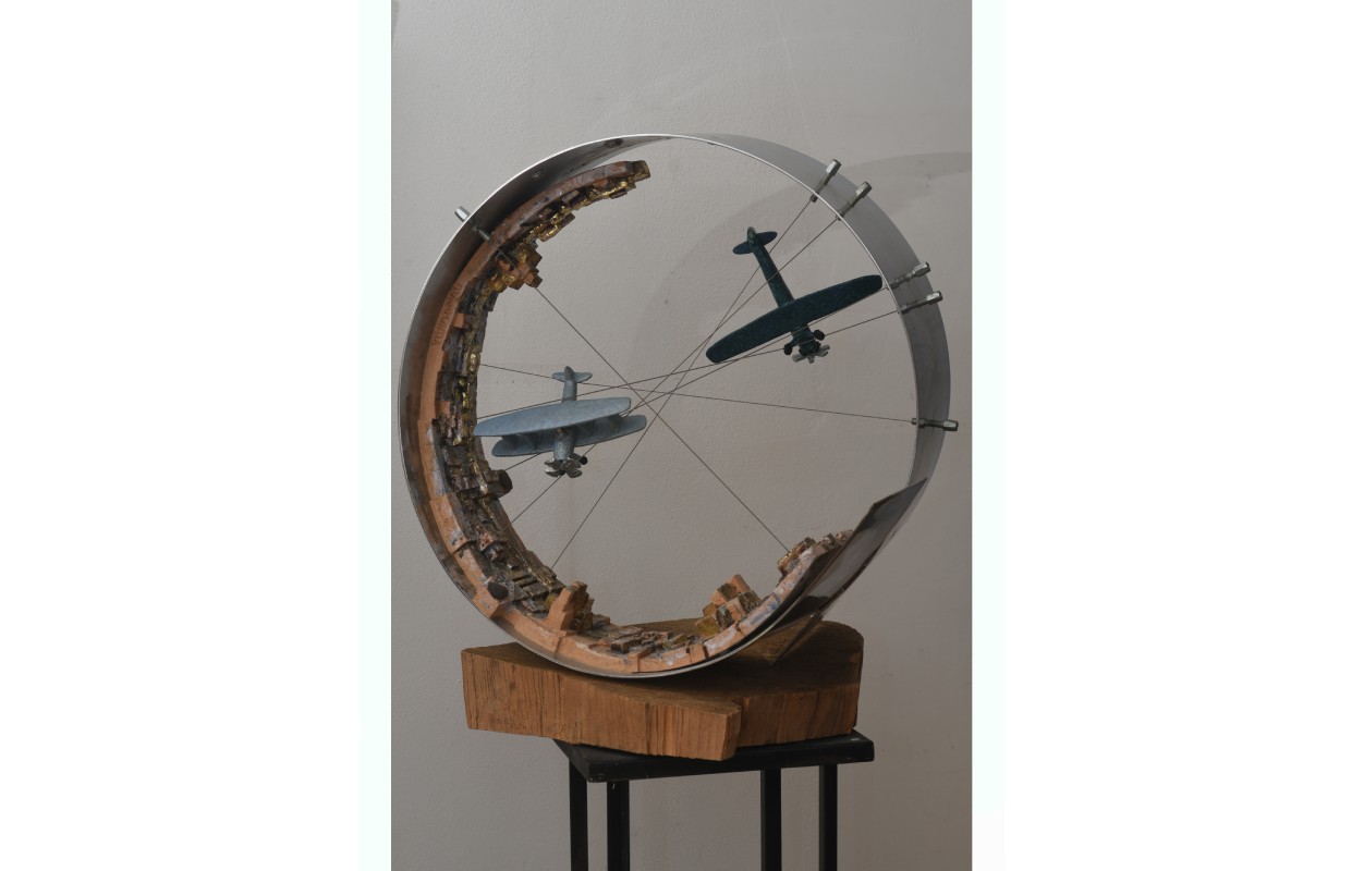 tecnica: Ceramica policroma con smalti, reagenti, otto corde metalliche su una lastra di acciaio lucidoalt. cm. 65 x 56 x 38