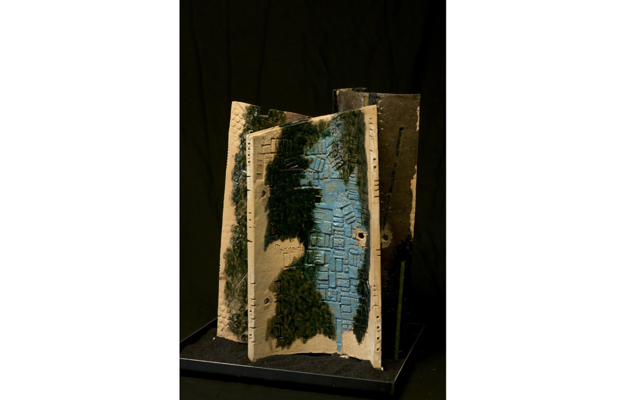 tecnica: ceramica policroma con smalti, reagenti, sassi e ferroalt. cm. 60 x 42 x 17