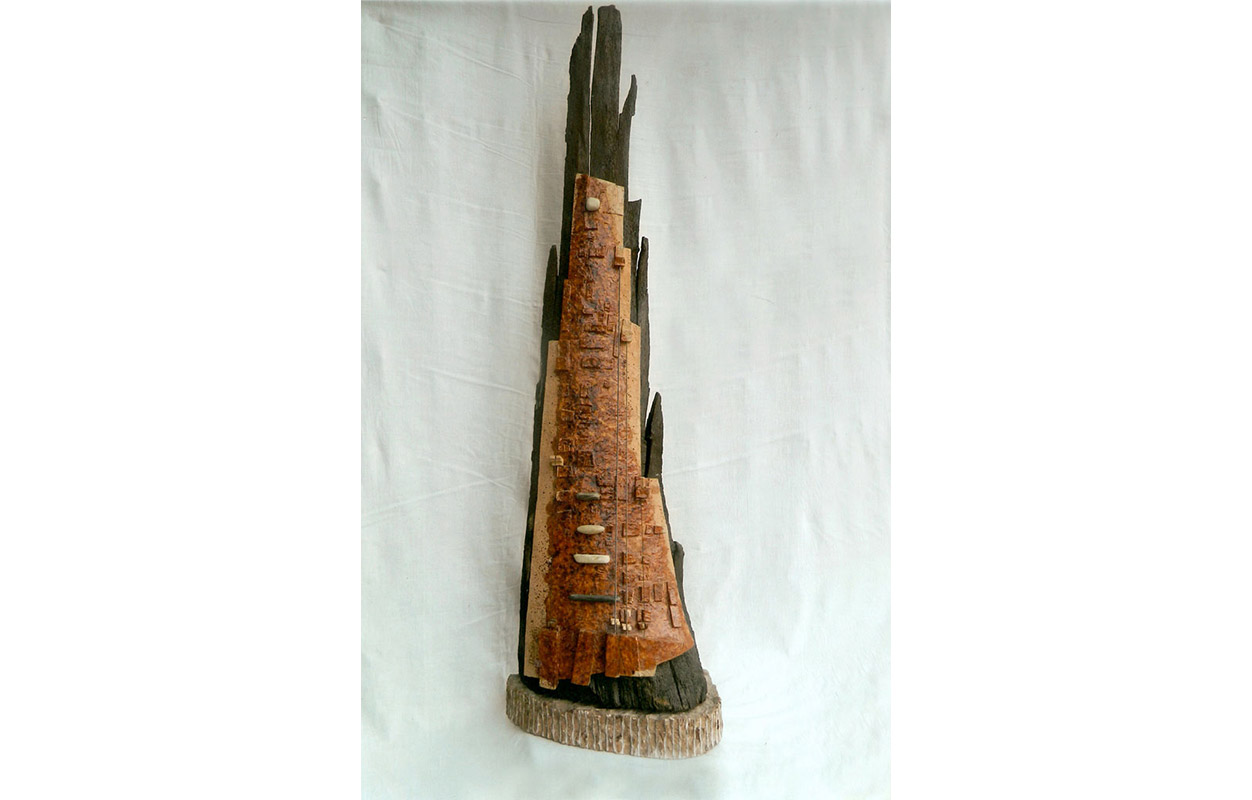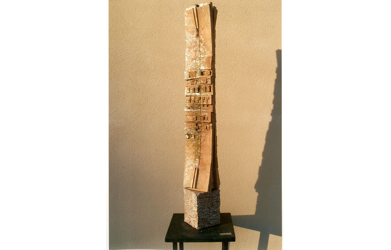 tecnica: terracotta policroma con smalti, ossidi, reagenti e due corde sonore, su una base in pietra martellataalt. cm. 103x15x15