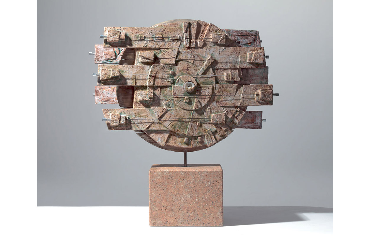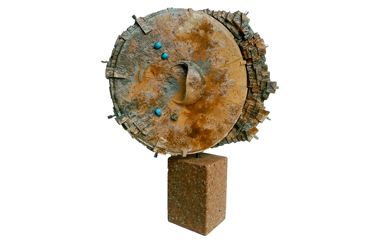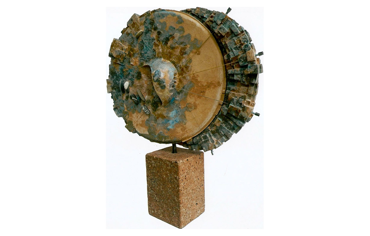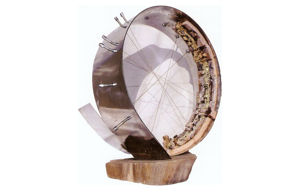tecnica: terracotta policroma con smalti, reagenti, ossidi più cinque corde sonore e una lastra di acciaio cromato, su una base di lamiera circolarealt. cm. 63x53x33