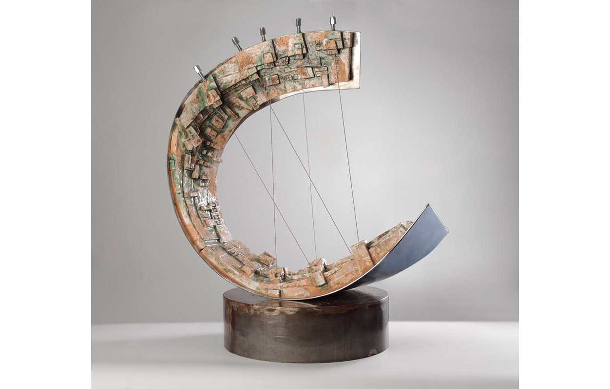 tecnica: terracotta policroma con smalti, reagenti, otto corde sonore, su una lastra di acciaio lucidato, su una base di legno di recuperoalt. cm. 65x56x38