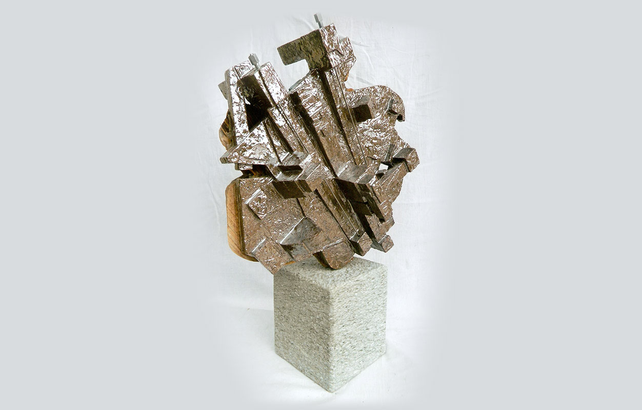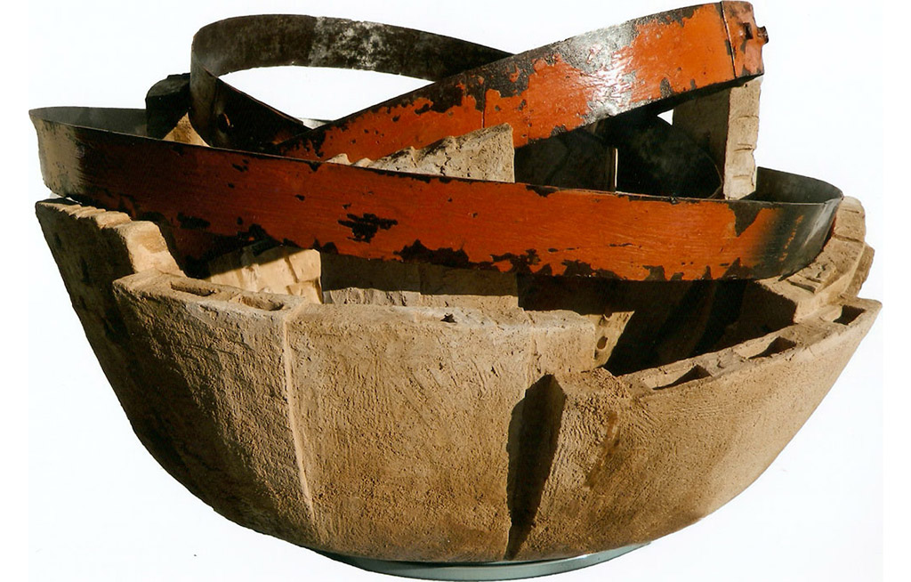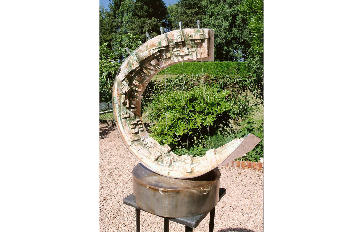 tecnica: terracotta refrattaria patina ta a freddo, con interventi manuali di applicazioni con foglia oro e argento più tre cerchi in acciaio trattato e una sfera cromataalt. cm. 30x50x50