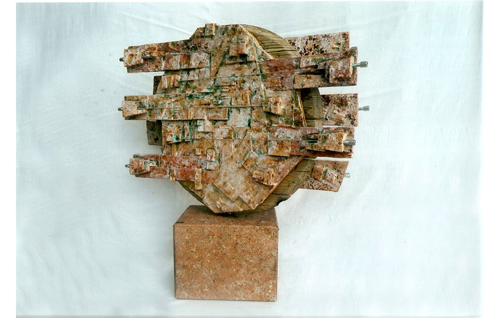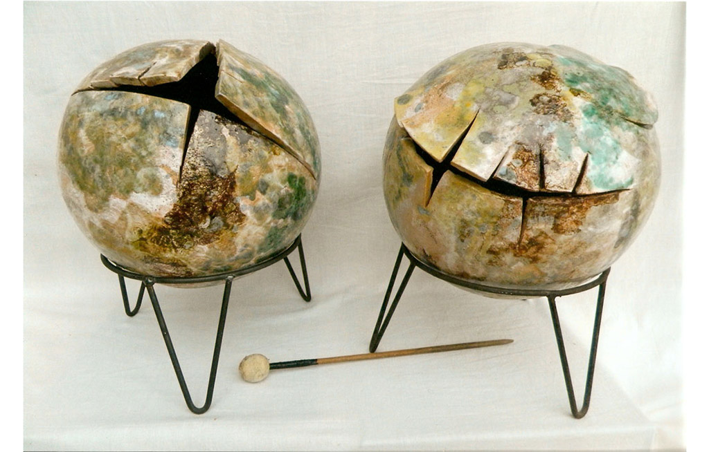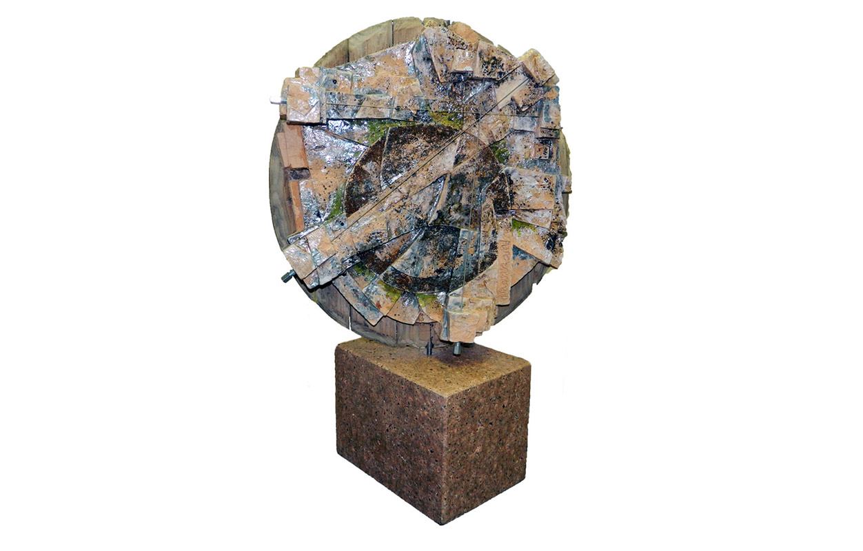 tecnica: terracotta policroma con smalti ossidi, reagenti, pietre colorate, sassi più nove corde sonore, su un base in pietraalt. cm. 63x51x15