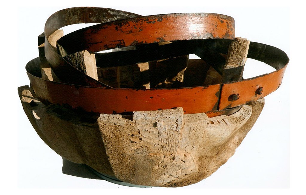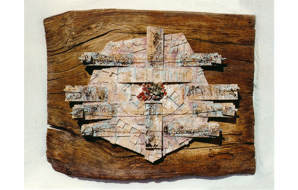 tecnica: terracotta policroma con smalti, ossidi reagenti, inserimenti di pirite, più tre corde sonorealt. cm. 52x66
